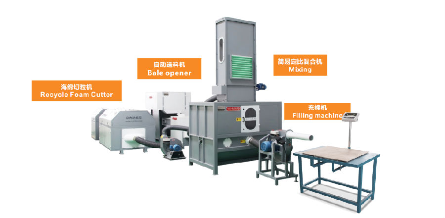另外,如果考慮在公仔棉中混入碎海綿,就需要配置一臺海綿切粒機或者碎海綿機,深圳市眾力達專利設(shè)計的海綿切粒機可將各種海綿、乳膠的邊角料切成均勻的粒狀與公仔棉混合填入枕頭。
