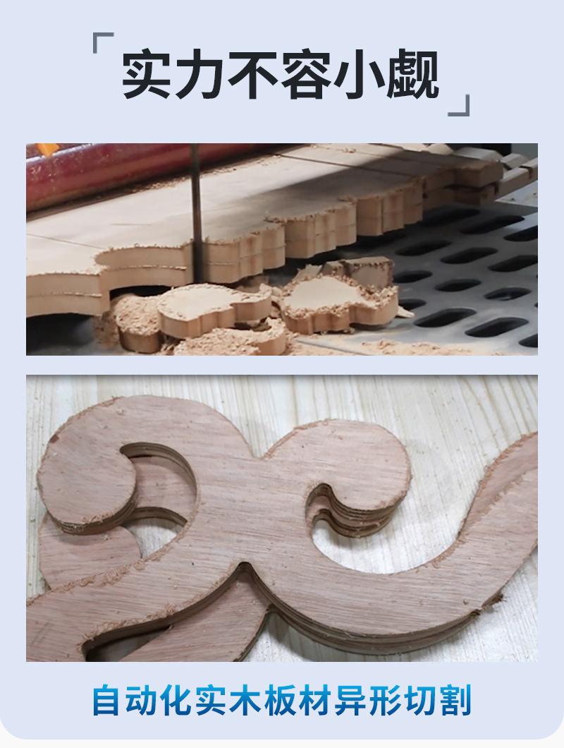 2.斷面光潔、加工精度高、速度快,代替?zhèn)鹘y(tǒng)帶鋸切屑死角和拐彎難題以及表面光澤度問(wèn)題,顛覆傳統(tǒng)實(shí)木下料前段工序、畫線、手動(dòng)開料、 鑼銑三道工序,降低人工成本,降低生產(chǎn)事故,提高生產(chǎn)效率。