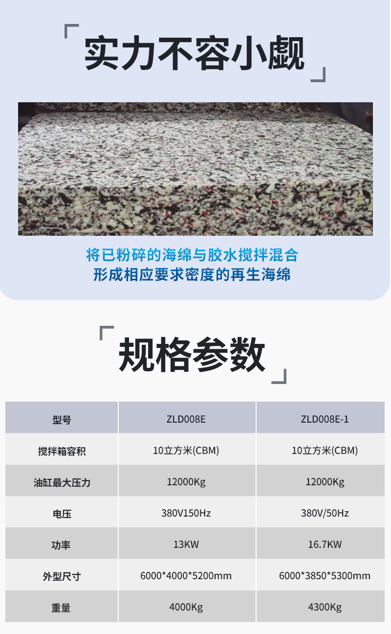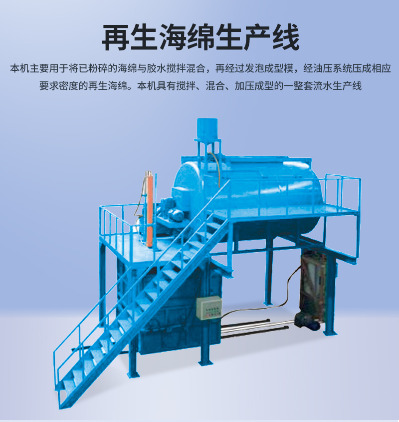 2.本機(jī)具有攪拌、混合、加壓成型的一整套流水生產(chǎn)線,生產(chǎn)效率真極高;與碎海綿機(jī)組合效果更佳。
