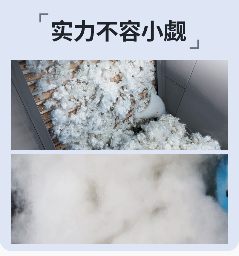 2.利用大小不同方向的滾齒運轉產(chǎn)生的拉力對各種短纖維(羊毛、聚酯纖維PP棉)進行梳理蓬松,開松率達99%以上;