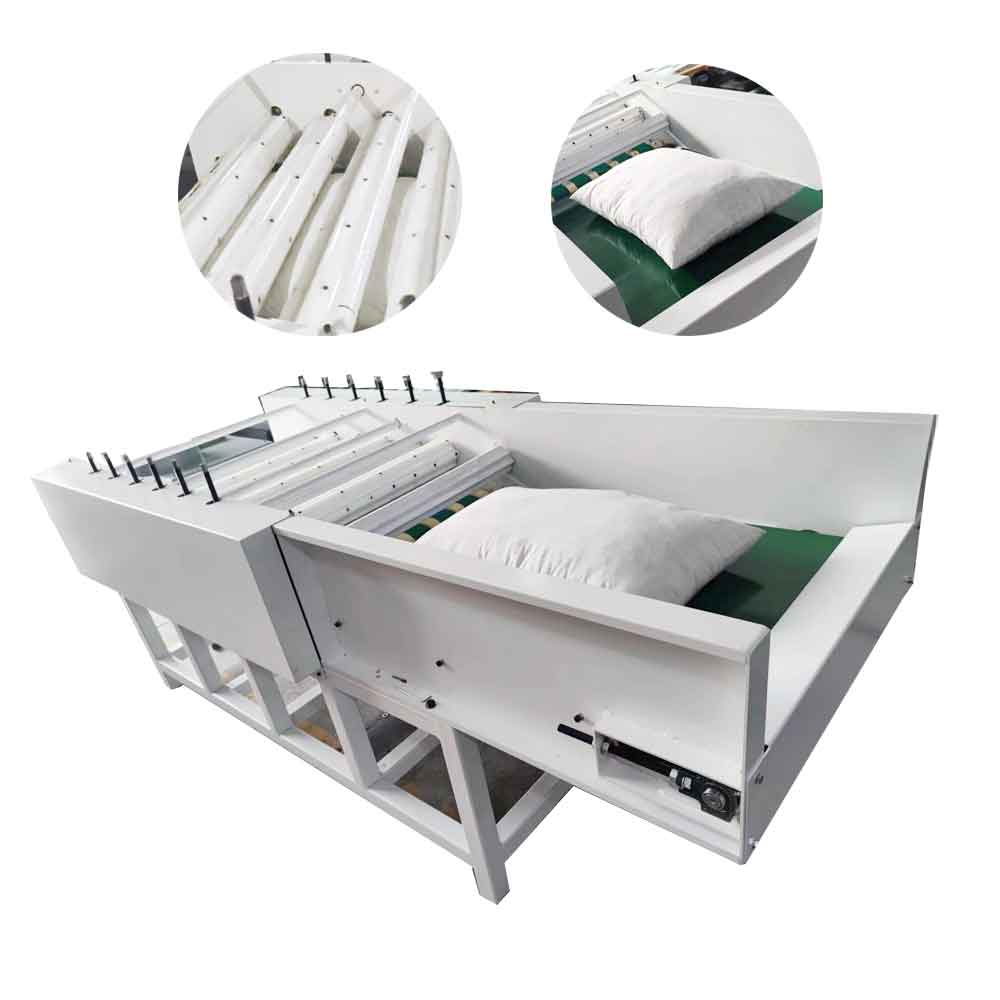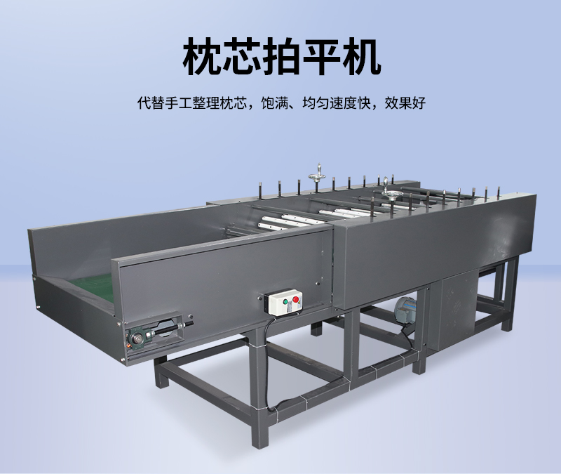 1.枕芯拍平機針對于剛填充完效果不平整的枕頭進行一次完整的滾壓拍打,使其效果更佳平整飽滿。2.本機有多款式供選擇,有6輥,9輥和12輥等。